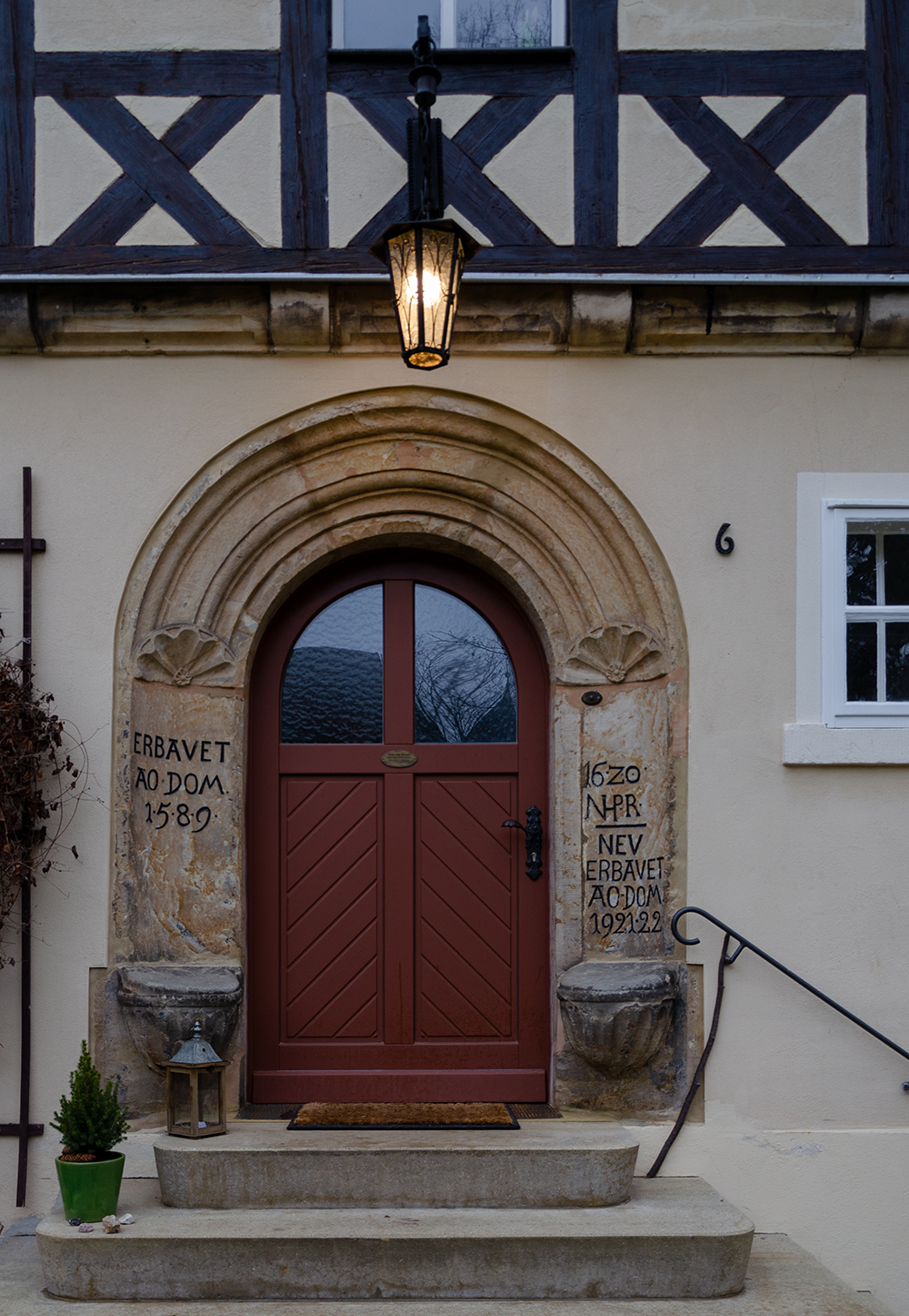 Die Inschrift im rechten Türpfosten ‚1620 N H P R‘ verweist auf Herrn Nicolaus Hoffmann – Pfarrer in Reinsberg von 1621 bis 1662.