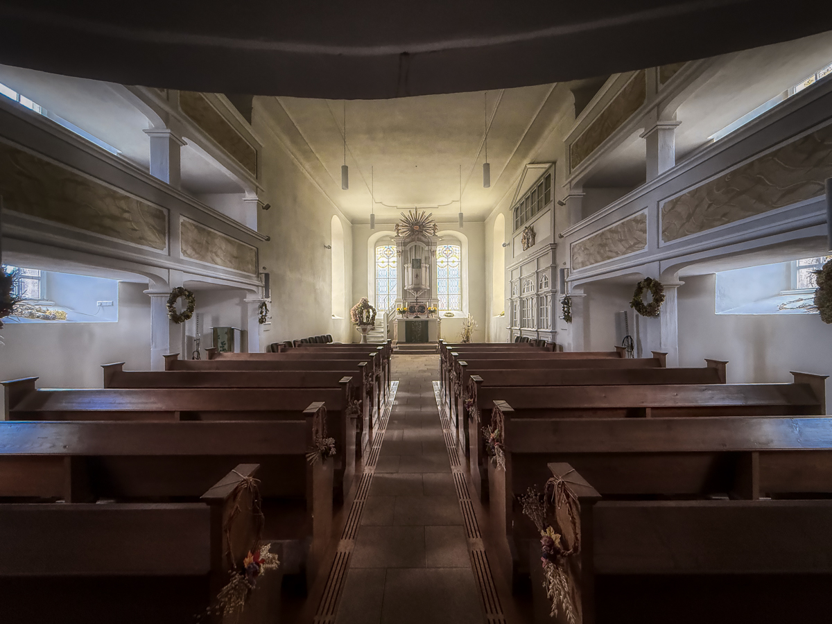 Ich trat durch das einfache Portal ein, und drinnen lag ein heller, fast sachlicher Raum, warm vom Holz der Emporen eingefasst. Zweigeschossig ziehen sie sich an drei Seiten entlang, ein Erbe jener Zeit, als Dorfkirchen noch streng nach Gemeindeordnungen saßen: Bauern, Handwerker, Honoratioren, jeder an „seinem Platz“. An der Chorsüdseite aber hebt sich eine Loge ab – die Patronatsloge derer von Schönberg, im Zopfstil gefasst, mit dem Wappen über dem Bogen. Wie viele Blicke aus dieser erhobenen Position wohl hinunter auf Kanzel und Altar gefallen sind, wie viele Familienfeiern, Taufen, Abschiede hier mit beobachtendem Ernst bedacht wurden?