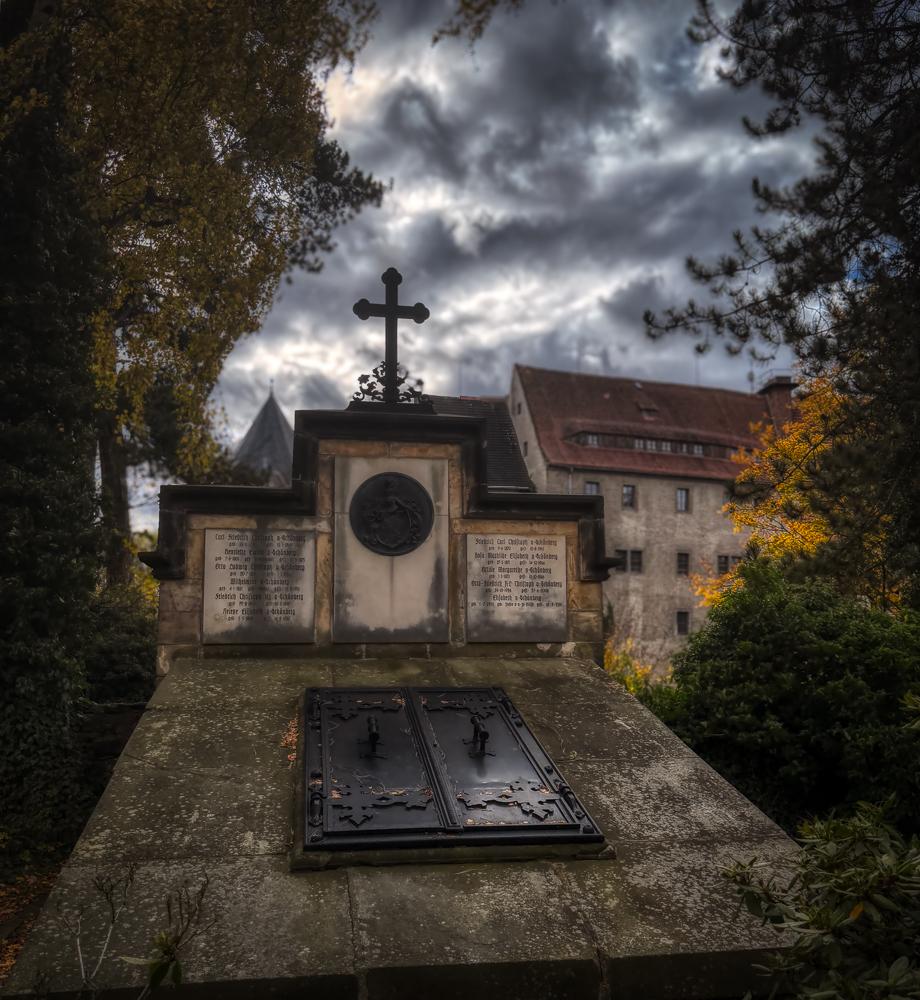 Draußen auf dem Kirchhof aber steht das, was den Ort mit einem sehr eigenen Zug versieht: die Schönberggruft. Eine niedrige, in die Mauer gefasste Anlage, mit verschlossener Türe und den altgewordenen Steinen, die den Namen der einstigen Herrschaft tragen. Hier liegt die Nähe zwischen Kirche und Gutsherrschaft noch greifbar da: nicht als Pomp, sondern als beständiger, stiller Anspruch. Der Wind fuhr über die Wipfel, die letzten Blätter lösten sich in kurzen, wirbelnden Stößen. Es war einer dieser Momente, in denen ein Ensemble plötzlich zu sprechen beginnt – von Besitz und Verantwortung, von dem Recht, das man sich nahm, und der Pflicht, die man trug.
