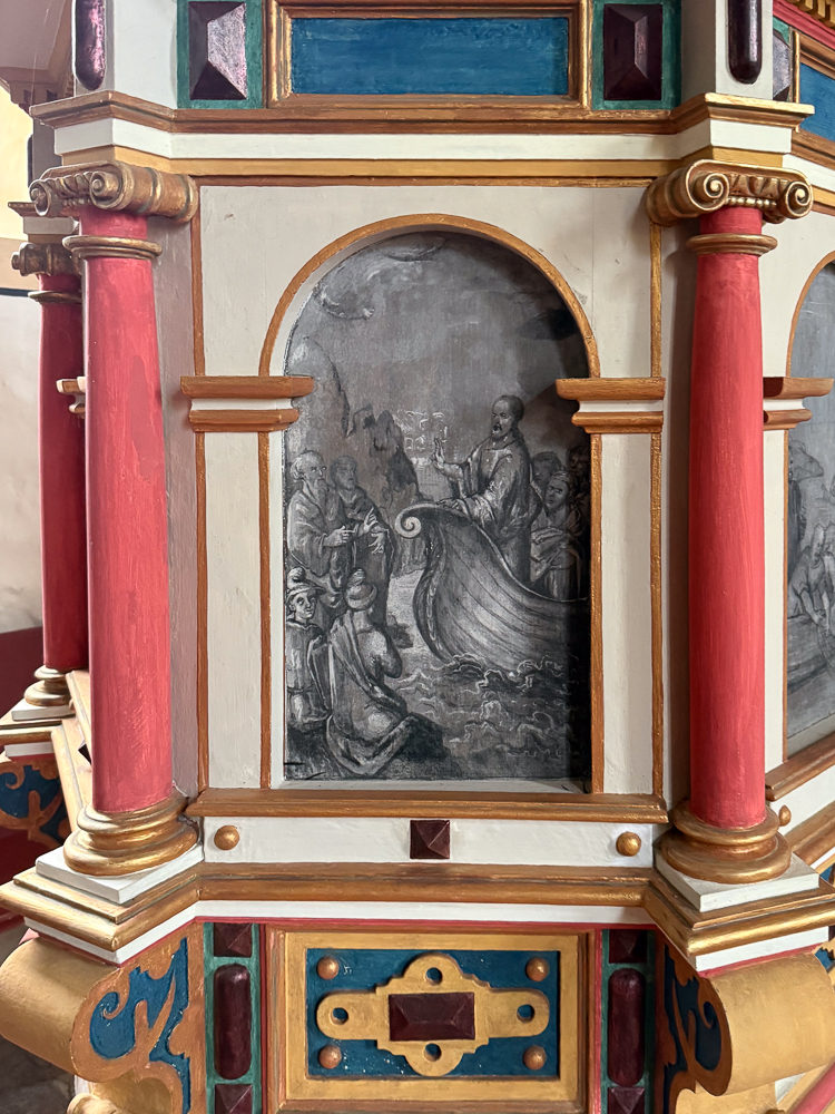 Die Ausstattung erzählt von mehreren Jahrhunderten Gemeindelebens: Der Kanzelkorb aus dem frühen 17. Jahrhundert ist ein kleines Schmuckstück. In seinen bogenförmigen Feldern sind feine Grisaillemalereien zu sehen – Johannes der Täufer, Christus predigend vom Boot, der wunderbare Fischzug. Im 19. Jahrhundert kam ein Ölbild des segnenden Christus hinzu, 1887 eine kleine Kienscherf-Orgel mit vier Registern. Die Glocke von 1567, in Stettin gegossen, schlägt bis heute.