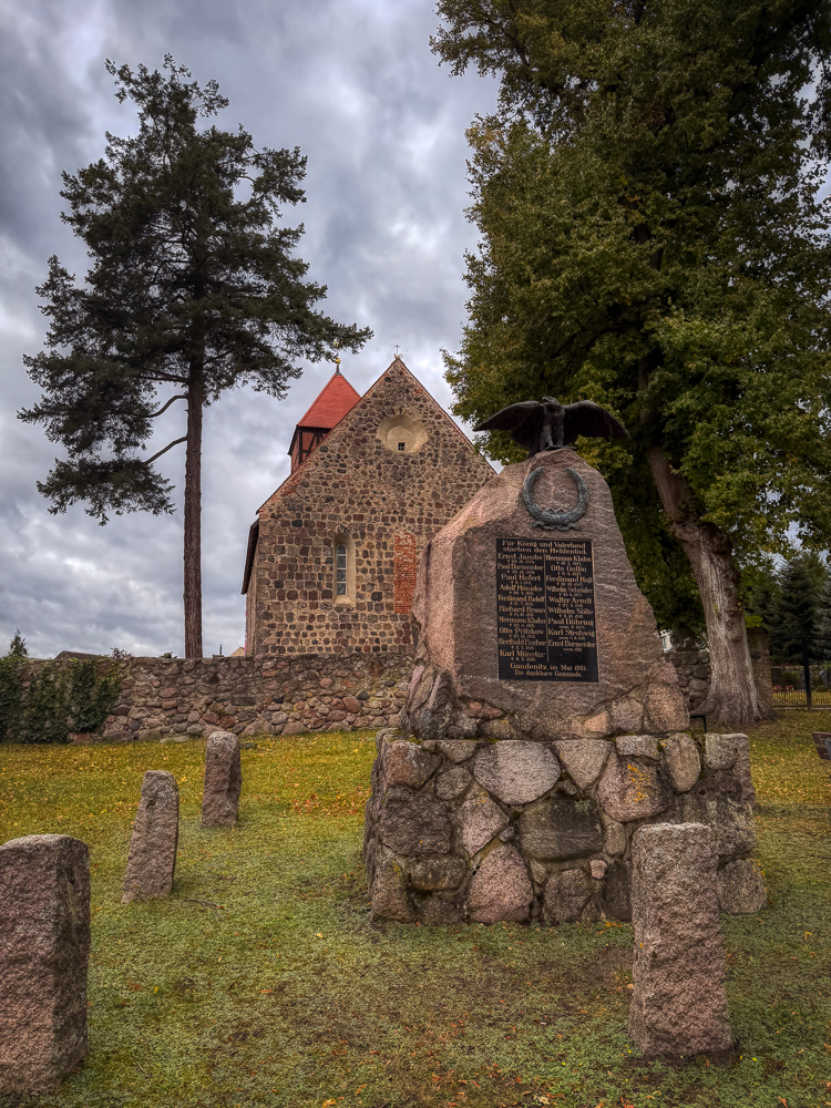 Nach dem stillen, beinahe poetischen Weg durch den herbstlich dämmernden Wald zum „Kirchlein im Grünen“ führte mich der nächste Abschnitt dieser kleinen Sonntagsfahrt in die offene Landschaft der Uckermark. Die Wolken trieben weiterhin rasch über den Himmel, ein stürmischer Wind zerrte an den Bäumen und trieb fahle Blätter über die Straßen – ein Wetter, das zur Jahreszeit passte und der Landschaft eine eigentümliche Klarheit verlieh. Auf schmalen Landstraßen gelangte ich nach Gandenitz, einem kleinen Ort nördlich von Templin, wo sich am Dorfrand, leicht erhöht, die Peter-und-Paul-Kirche erhebt.