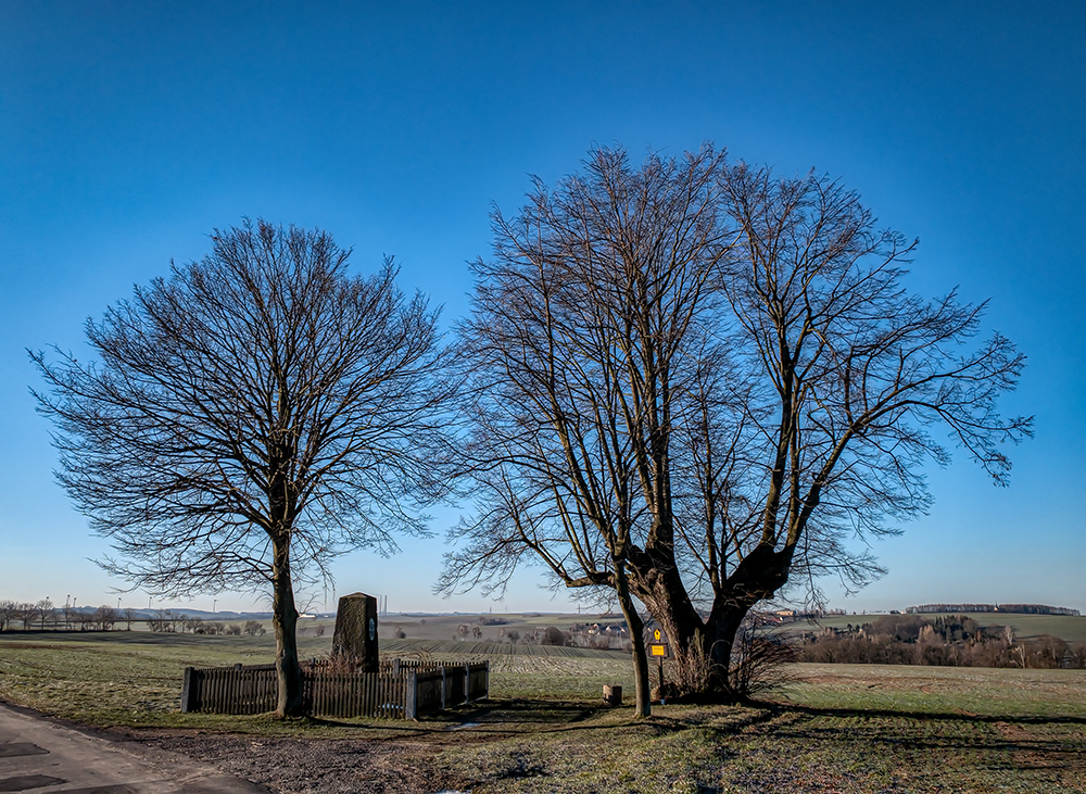 Übrigens ist der grössere Baum auch ein besonderer. es handelt sich um eine Winterlinde mit 4,80m Stammumfang (2010) die ca. 200 Jahre alt ist. Aufgrund ihrer exponierten Lage stellt sie eine markante Landmarke dar!